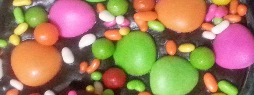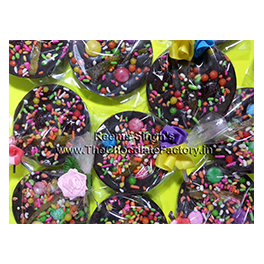 Mendiant, a traditional French confection, modified for kids. Chocolate disc adorned with hard-to-resist candies. Disc Size 6.5cm diameter. Dark discs 32 - 35 gms each.