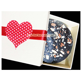 A box, with handcrafted premium quality homemade chocolate Dryfruit Mendiant, a traditional French confection, adorned with a beautiful red heart. Packing can be custom-made to order. Disc Size 13cm diameter. Dark chocolate with dryfruits 400 gms.