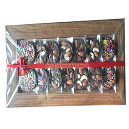 A woodlike tray with 10 dryfruit and 4 candyland mendiants handcrafted with premium quality chocolates, adorned with a red ribbon. Packing can be custom-made to order. Disc Size 6.5cm diameter. Dark discs 32 - 35 gms each.