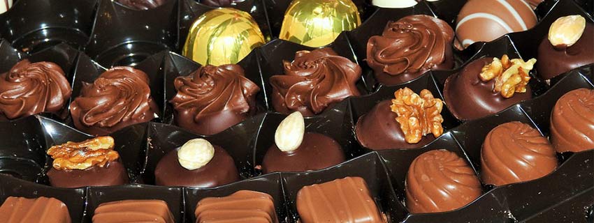 An exotic chocolate assortment box with 6 plain dark chocolates, 6 dark nuts chocolates and 6 dryfruit delicatessen which include 2 cranberry cubes; 2 blueberry cubes and 2 dates cubes.