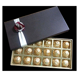 A cardboard box, made from premium quality handmade paper with plastic cavity tray for 18 round handcrafted premium quality homemade chocolates (16 gm each), adorned with maroon cream flowers and ribbons. Packing can be custom-made to order.