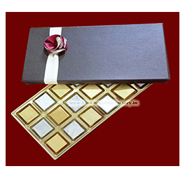 A cardboard box made from premium quality handmade paper with plastic cavity tray for 18 square handcrafted premium quality homemade chocolates (13 gm each), adorned with maroon cream flowers and ribbons. Packing can be custom-made to order.