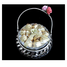 A white metal basket, with a glass bowl full of handcrafted premium quality homemade, half sphere chocolates. 15 Dark plain chocolates (approx 15 gm each).