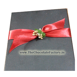 A black cardboard box with plastic cavity tray for 18 plain handcrafted premium quality homemade chocolates, adorned with a red ribbon. Packing can be custom-made to order. Dark Plain chocolates. 13 gms each.