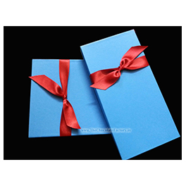 A blue cardboard box with plastic cavity tray for 18 plain handcrafted premium quality homemade chocolates, adorned with a red ribbon. Packing can be custom-made to order. Dark Plain chocolates. 13 gms each.