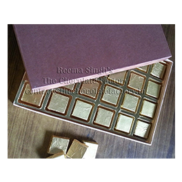 A cardboard box with plastic cavity tray for 24 plain handcrafted premium quality homemade chocolates, adorned with a cream ribbon. Packing can be custom-made to order. Dark Plain chocolates. 13 gms each