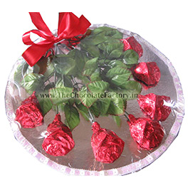 A round tray with 7 handcrafted premium quality homemade rose shaped chocolates, adorned with red ribbons. Packing can be custom-made to order. Dark crackle 20 gms each.