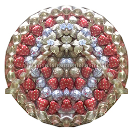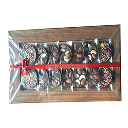 A woodlike tray with 10 dryfruit and 4 candyland mendiants handcrafted with premium quality chocolates, adorned with a red ribbon. Packing can be custom-made to order. Dark discs 32 - 35 gms each.