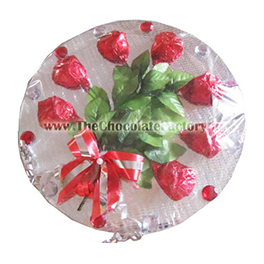 A glass tray with 7 handcrafted premium quality homemade rose shaped chocolates (crackle 20 gms each), adorned with red ribbons. Packing can be custom-made to order.