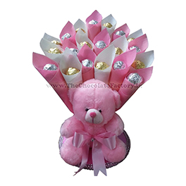 A tray with handcrafted premium quality homemade chocolates, adorned with beautiful decorations and a teddy bear. Packing can be custom-made to order. Dark Plain Chocolates (16gms each).
