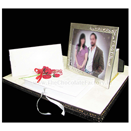 A tray with wedding invite, a box of handcrafted premium quality homemade chocolates and the photograph of the couple in a frame. Packing can be custom-made to order.