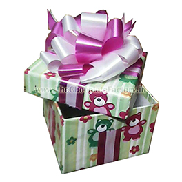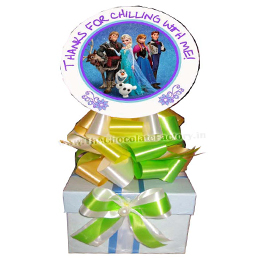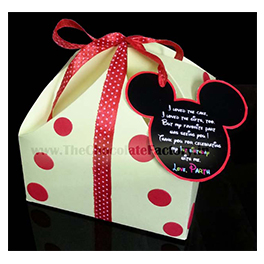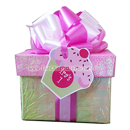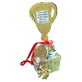 A box, full of handcrafted premium quality homemade chocolates, with a theme based cut-out; topped with ribbons. Packing can be custom-made to order. With dark plain chocolates 15 pieces.