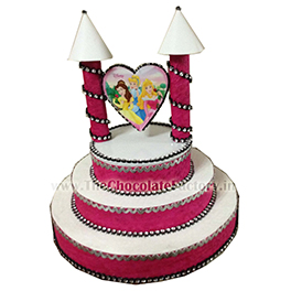A box in the shape of a cake, full of handcrafted premium quality homemade chocolates, topped with castle and cutout. Packing can be custom-made to order. With dark plain chocolates 15 pieces.