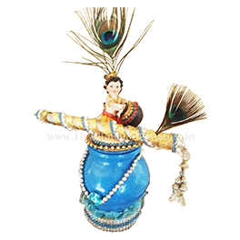 An earthen pot beautifully painted and decorated with and idol of Shri Krishna and a flute, full of handcrafted premium quality homemade chocolates. Packing can be custom-made to order. With dark plain chocolates 15 pieces.
