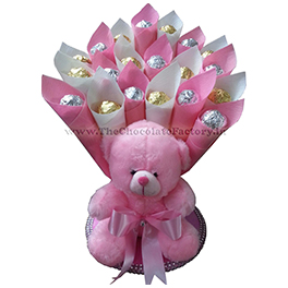 A beautiful bouquet of handcrafted premium quality homemade chocolates with a cute teddy. Packing can be custom-made to order. With dark nuts chocolates 24 pieces.