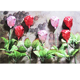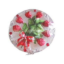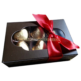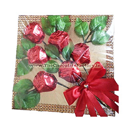 A small tray with 6 handcrafted premium quality homemade rose shaped chocolates (crackle 20 gms each), adorned with red ribbons. Packing can be custom-made to order.