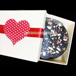 A box, with handcrafted premium quality homemade chocolate dryfruit discs, adorned with a beautiful red heart. Packing can be custom-made to order. Dark chocolate with dryfruits 400 gms